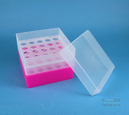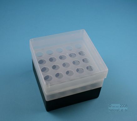 EPPi® Box 105 / 5x5 Löcher, Höhe 105 mm fix. Innenhöhe 103 mm. Für 25 Röhrchen bis 17 mm Ø. Zum Beispiel für Kulturröhrchen 14 ml. Ohne Fachcodierung, PP.
