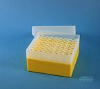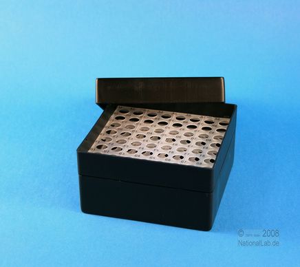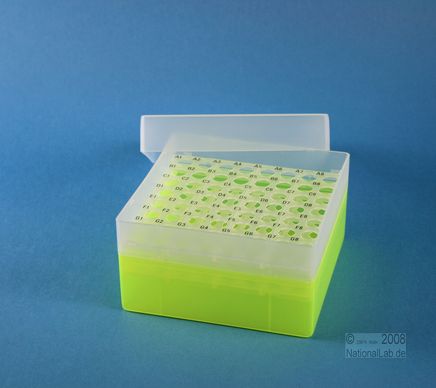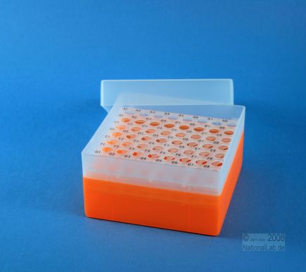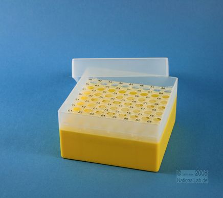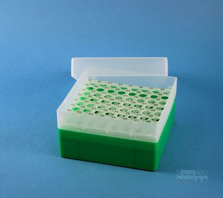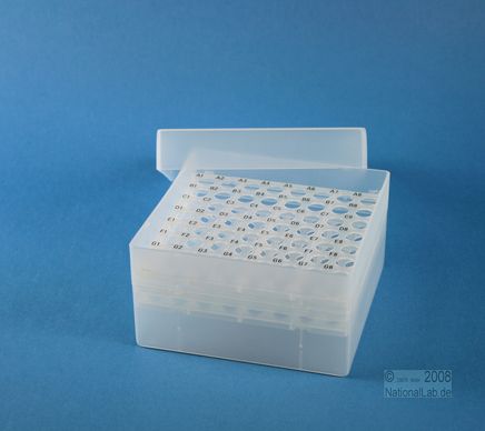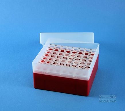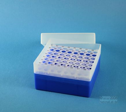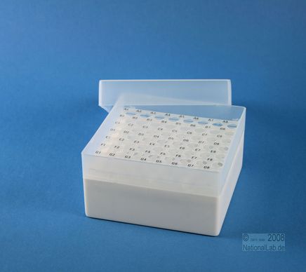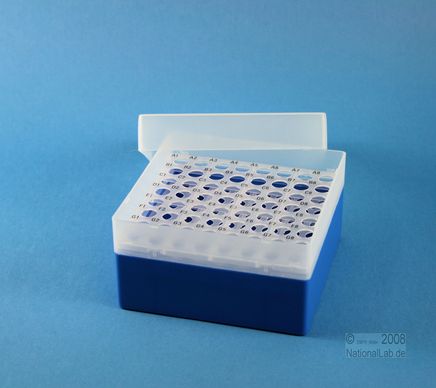 EPPi® Box 70 / 8x8 Löcher, Höhe 70-80 mm variabelEPPi® Box 70 / 8x8 Löcher, Höhe 70-80 mm variabel. 8x8 Löcher für 64 Röhrchen bis 11 mm Ø. Mit alpha-numerischer Codierung an den Löchern, PP.