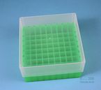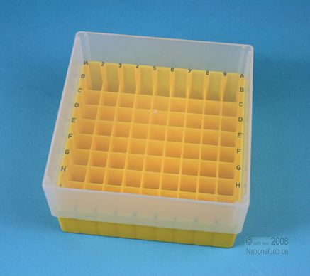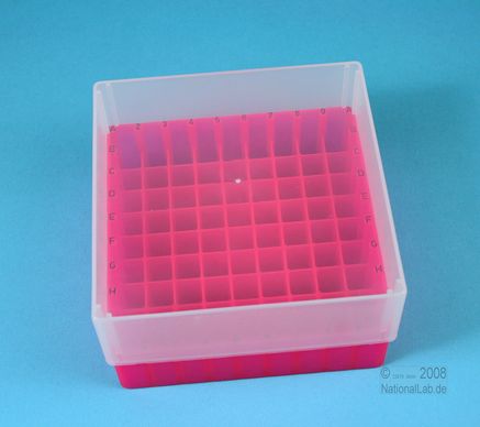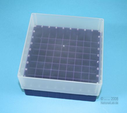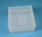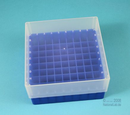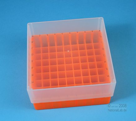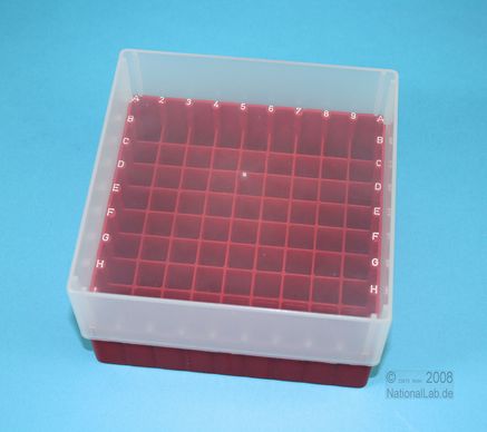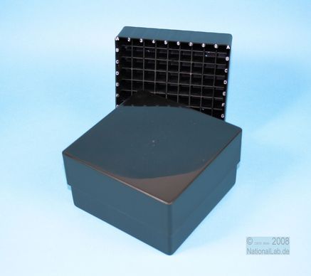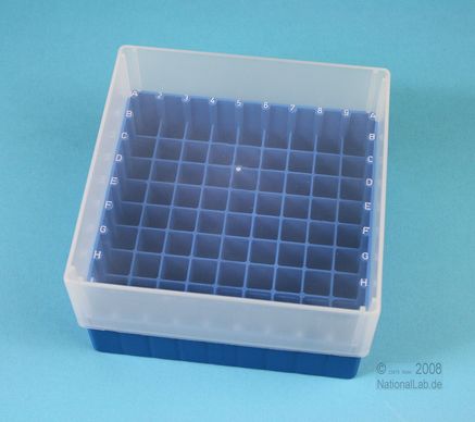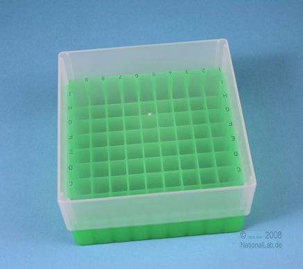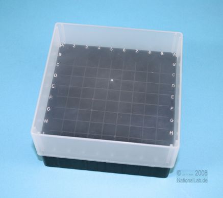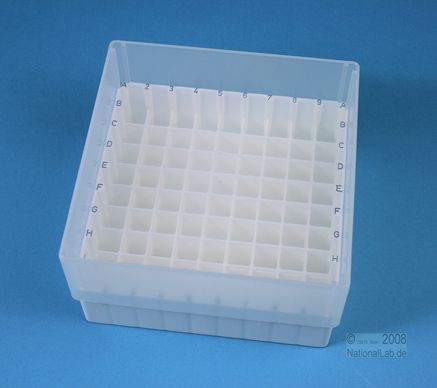 EPPi® Box 75 / 9x9 Fächer, Höhe 75 mm fix. Innenhöhe 73 mm. 9x9 Fächer für 81 Röhrchen bis 12,5 mm Ø. Mit alpha-numerischer Fachcodierung auf allen 4 Seitenrändern, PP.