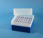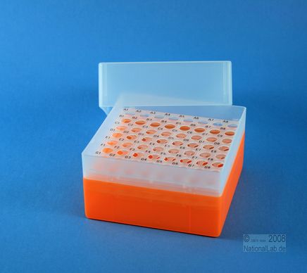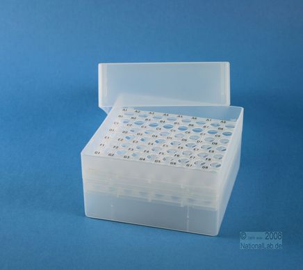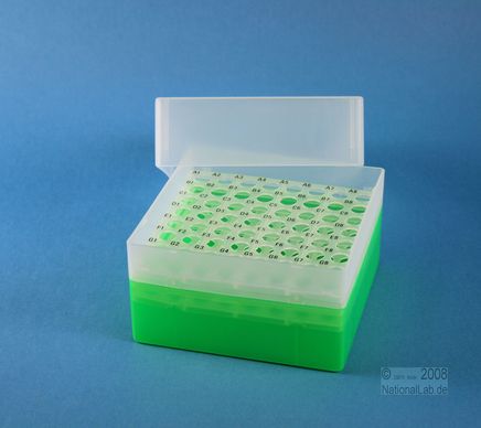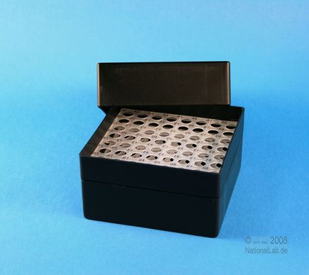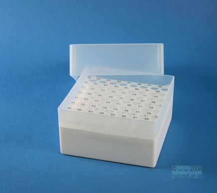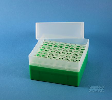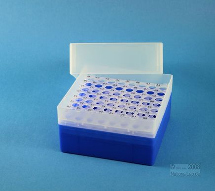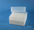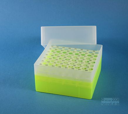 EPPi® Box 102 / 8x8 Löcher, Höhe 102 mm fix. Innenhöhe 100 mm. 8x8 Löcher für 64 Röhrchen bis 11 mm Ø. Mit alpha-numerischer Codierung an den Löchern, PP.