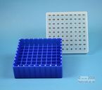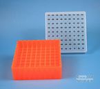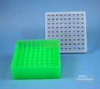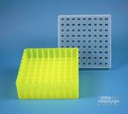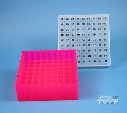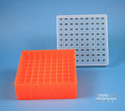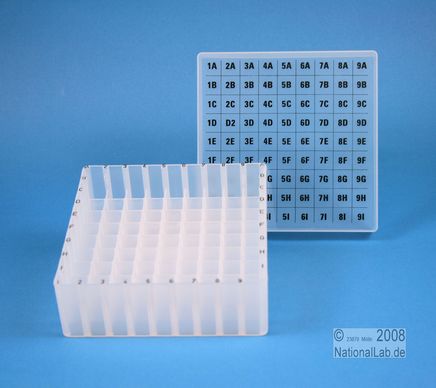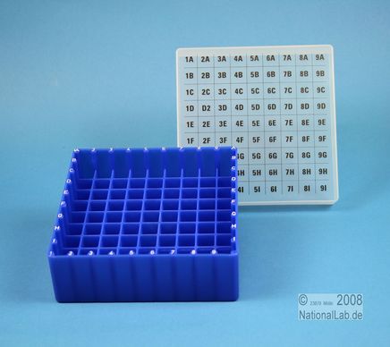 EPPi® Box 50 / 9x9 Fächer, Höhe 52 mm fix. Innenhöhe 50 mm. 9x9 Fächer für 81 Röhrchen bis 12,5 mm Ø. Mit alpha-numerischer Fachcodierung auf allen 4 Seitenrändern sowie auf dem Boden (durchscheinend) und auf dem Deckel, PP. (Siehe auch KEE45).