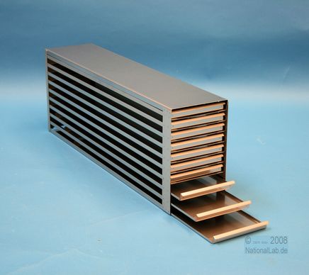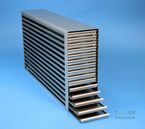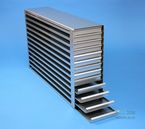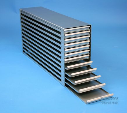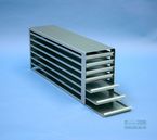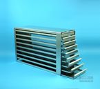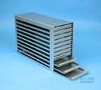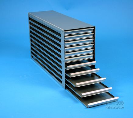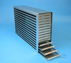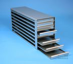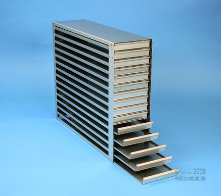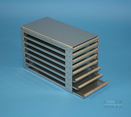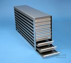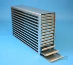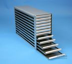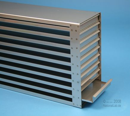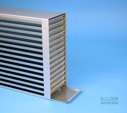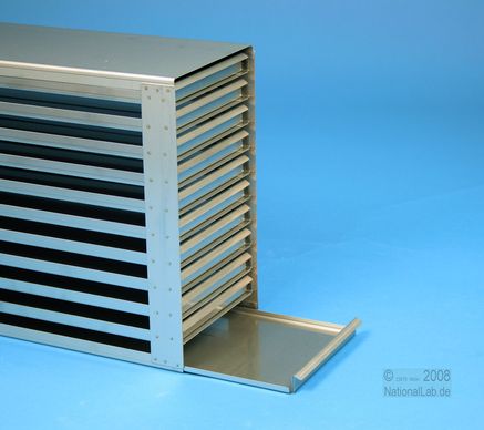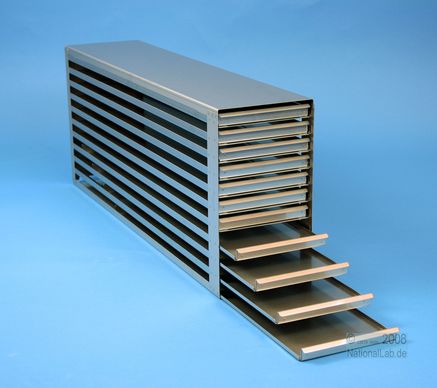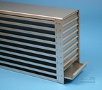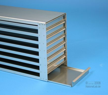 Mikrotiter Schrankeinschübe für Mikrotiterplatten bis 86x128x18 mm, Edelstahl, offene Bauform, Griffleiste, ohne Auszugstop, Böden der Schubladen geschlossen