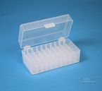 VICTOR Box 59 / 5x10 Fächer für 50 Röhrchen bis 12,0 mm Ø. Klappdeckel mit Scharnieren. Mit alpha-numerischer Fachcodierung auf den Seitenrändern, PP. Außenmaße (BxTxH) = 141x85x59 mm