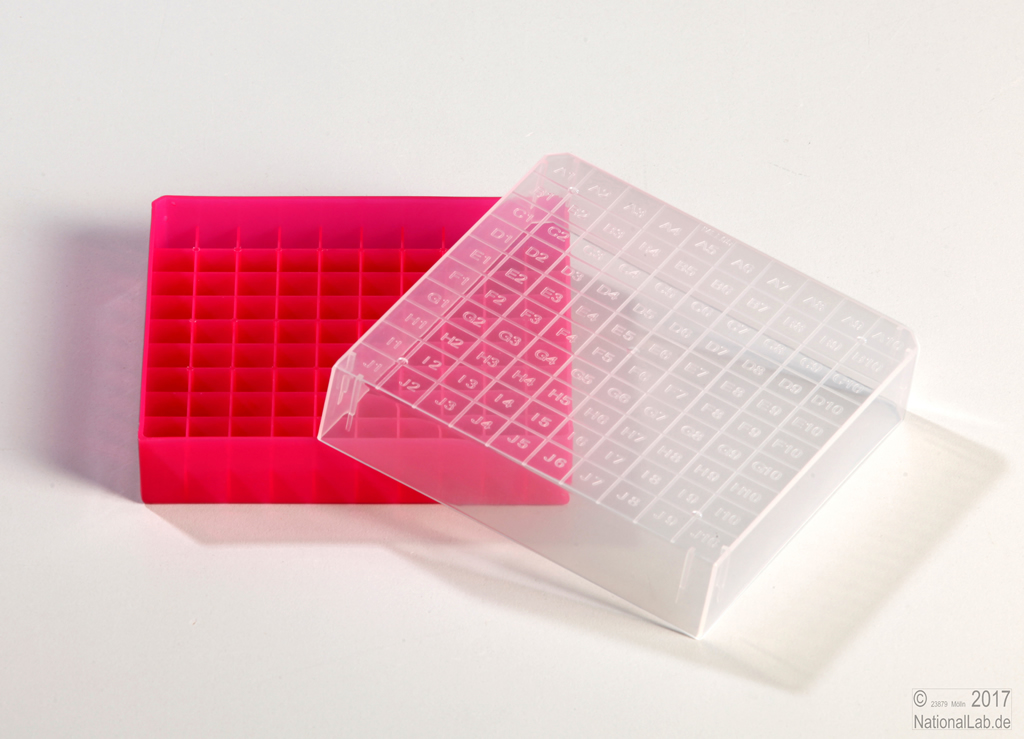 10x10 Fächer für Röhrchen bis 12,3 mm ø. Mit alpha-numerischer Fachcodierung auf dem Deckel und dem Boden. Mit Verdrehsicherung. PP. Geeignet für EPPi® Kryo-Röhrchen.