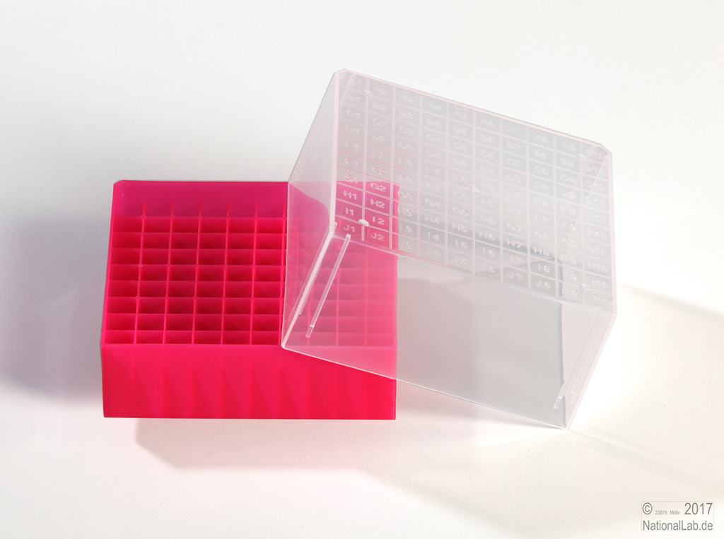 10x10 Fächer für Röhrchen bis 12,3 mm ø. Mit alpha-numerischer Fachcodierung auf dem Deckel und dem Boden. Mit Verdrehsicherung. PP. Geeignet für EPPi® Kryo-Röhrchen.